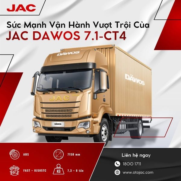 Trong bối cảnh ngành vận tải yêu cầu cao về chất lượng, an toàn và hiệu quả, Xe tải JAC Dawos 7.1-CT4 chính là giải pháp tối ưu cho doanh nghiệp và cá nhân. Xe không chỉ mạnh mẽ, bền bỉ mà còn tiết kiệm nhiên liệu và thân thiện với môi trường. Với nền tảng công nghệ hiện đại và dịch vụ hậu mãi chu đáo, Ô tô JAC đã khẳng định Xe tải JAC Dawos 7.1-CT4 xứng đáng là lựa chọn hàng đầu cho mọi cung đường.