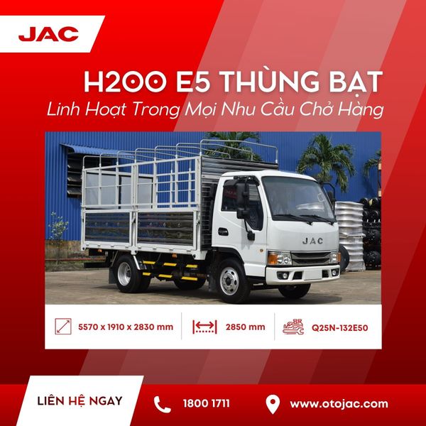 Xe tải JAC H200 E5 thùng bạt là lựa chọn lý tưởng cho các doanh nghiệp vận tải và trung tâm đào tạo lái xe, đáp ứng trọn vẹn yếu tố kinh tế, tiện dụng và an toàn. Với thiết kế thùng bạt rộng rãi, động cơ mạnh mẽ, tiêu chuẩn khí thải Euro 5, cùng khả năng tiết kiệm nhiên liệu và vận hành ổn định, đây là dòng xe linh hoạt, bền bỉ và đáng tin cậy trên thị trường.